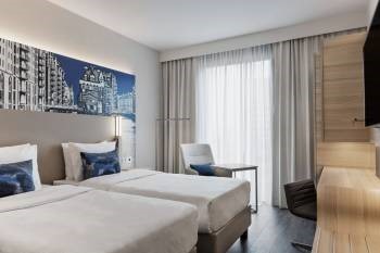 Our hotel has 277 modern rooms including 14 superior rooms and 5 suites. All rooms and suites feature a bathroom with walk-in shower and luxurious Marriott beds with either one king bed, one queen bed or two twin beds. The room has a stylish work area and a modern seating area. Free high-speed Wi-Fi, coffee and tea making facilities, air conditioning, flat screen 49 inches, mini-fridge, hairdryer, in-room safe, iron and ironing board are included. The modern, well-appointed, new rooms make our guests feel right at home.